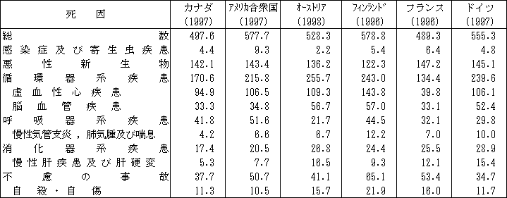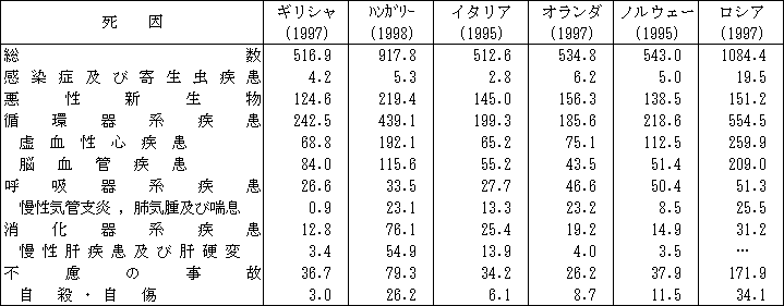 WHO, 1997-99 World Health Statistics Annual, (http:/www.who.int/whosis) Online Bersion による。標準人口は世界人口による。死亡分類は国によって異なるところもあるので,死因分類は必ずしも一致しない。
